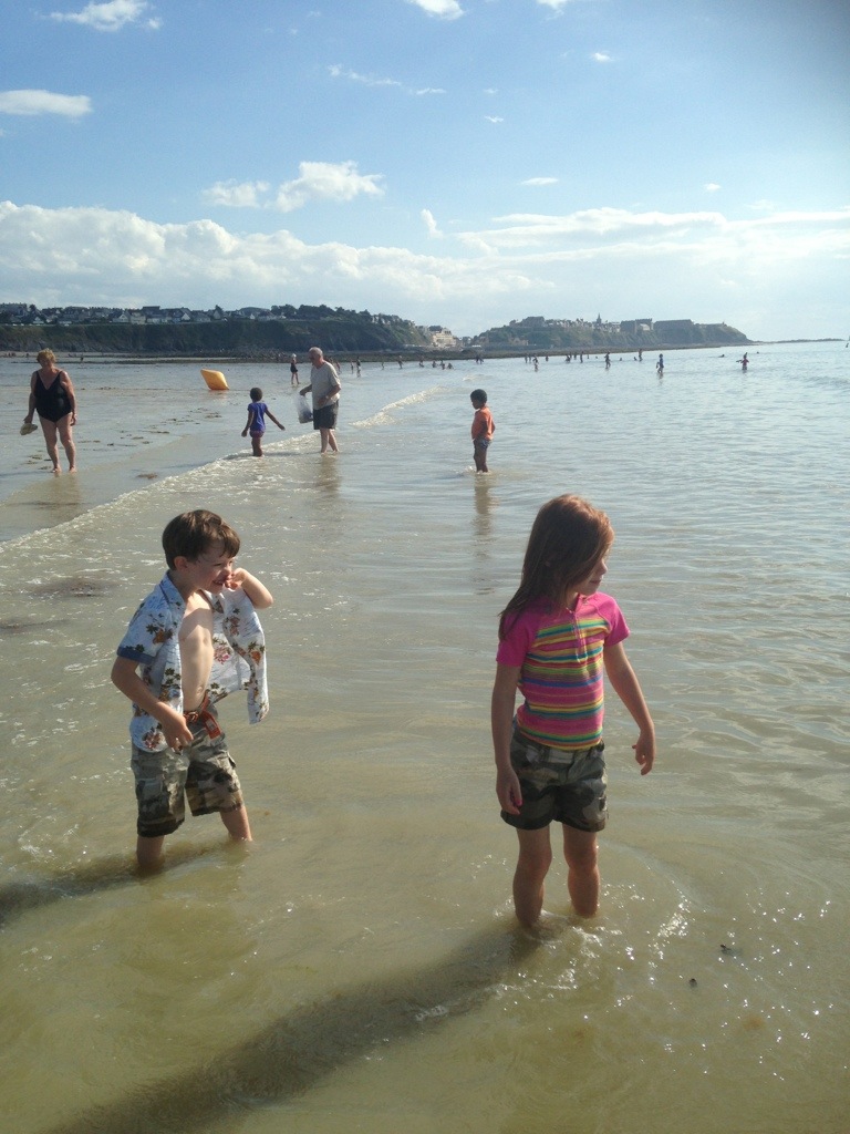 We made it off the ferry fine and the Aussie got a stamp in her passport…. Then we needed to go to a supermarket. The planed stop was aborted due to a low height barrier at the entrance to the car park, quickly we regrouped and headed for an alternative. We made essential purchases of cheese, wine, bread and orangina then the pressing purchase of oil. Stew told me to buy good oil, I have no idea what constitutes that so I just bought the most expensive! I managed to fill p the oil, check the level then get a face full as I set the bottle down. Stinking of motor oil I pressed on, negotiated my first solo French filling station visit and then relied heavily on Alexander the sat nav to get us to Granville. I’ve got to be honest…. I forgot the map showing the whole of France (stew if you are reading this could you add that to your list of things to bring, I think it’s in the playroom!) so I knew the rough direction but had absolutely no idea of how to get here. Te sat nav took us a very beautiful and scenic route, but I’m less an convinced it was the quickest. There was one particular moment when the cry of I’m going to be sick mummy emanated from the rear and an urgent pull over was required. On narrow country road my only option was to block a farmers driveway, and stalled the van, resolving the vomit situation, another moment of van not starting was expertly negotiated by rolling the van back a few inches and trying again. The rest of the journey passed without any excitement until we saw the sea.