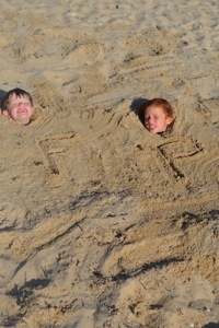 We got ready and headed straight to the beach for high tide, and it was beautiful. The sea was so clear, the sand so soft and the sky so blue. Penny and stew swam out to the boats that we walked past this morning, then we buried the children in the sand. We also buried stew!