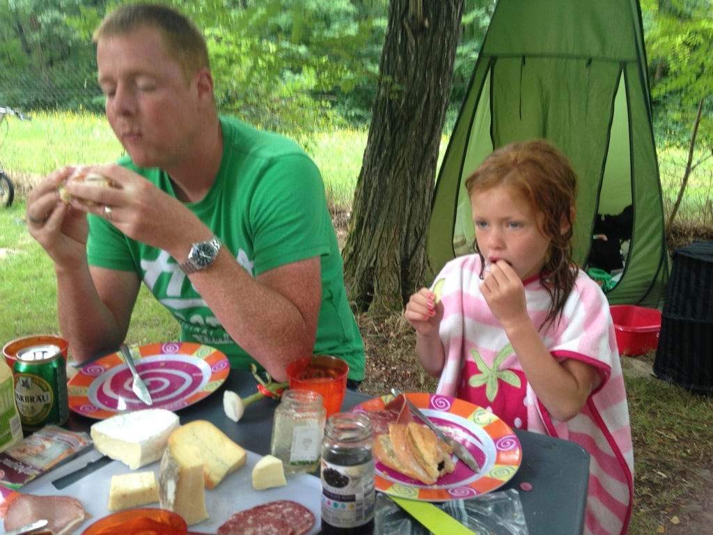 Today started in wonderful unbroken sunshine beaming through the trees above our pitch. Silly us didn’t order bread yesterday, so Stew was sent to the local village on his bike to get bread. The instructions were a right turn out of the site and right at the end of the road. Half an hour later in rolled a sweaty husband having taken a wrong turning and an impromptu tour of the French countryside! Meanwhile I enjoyed my coffee, then stews!