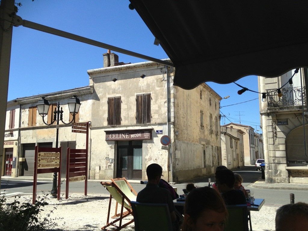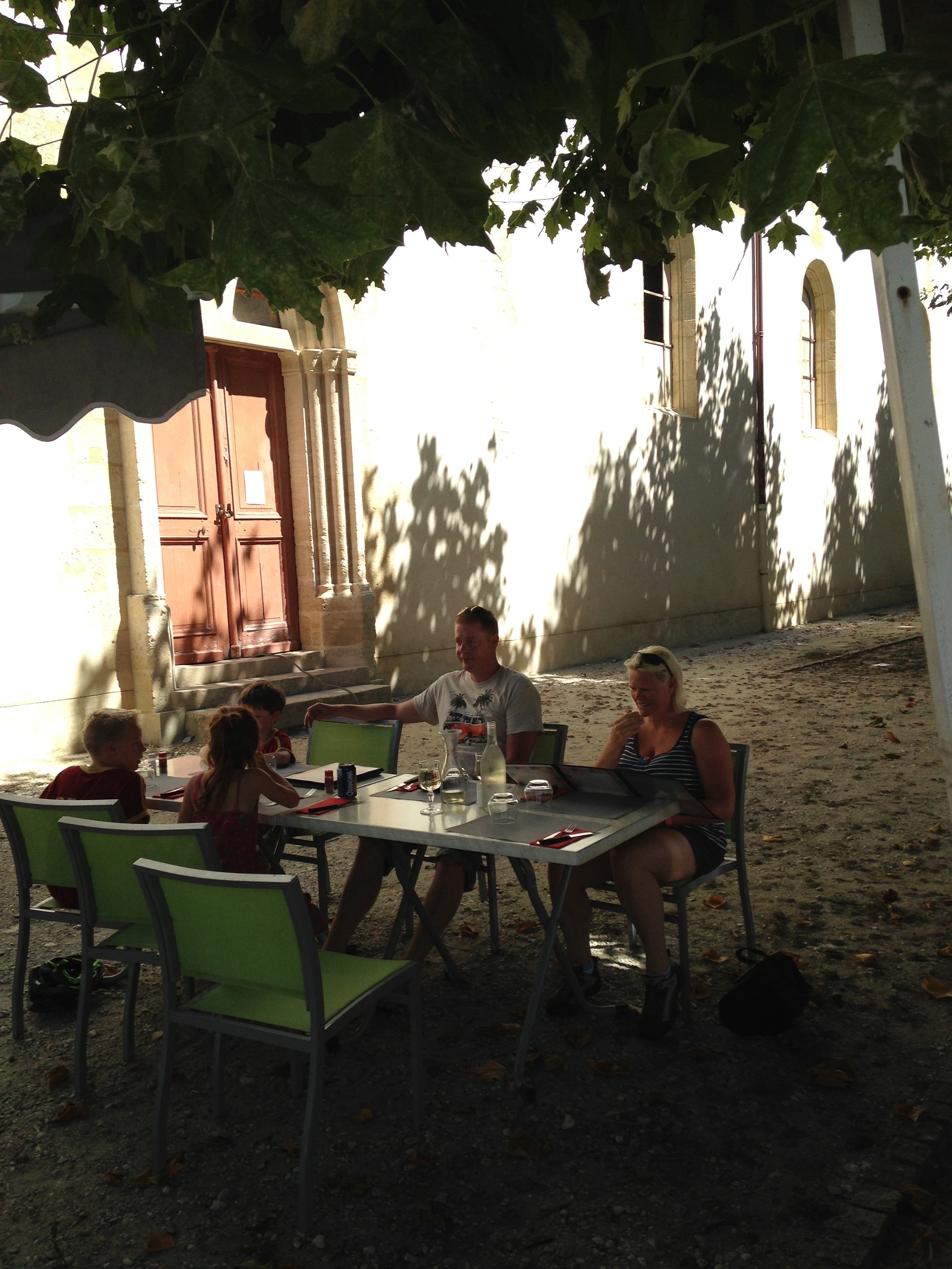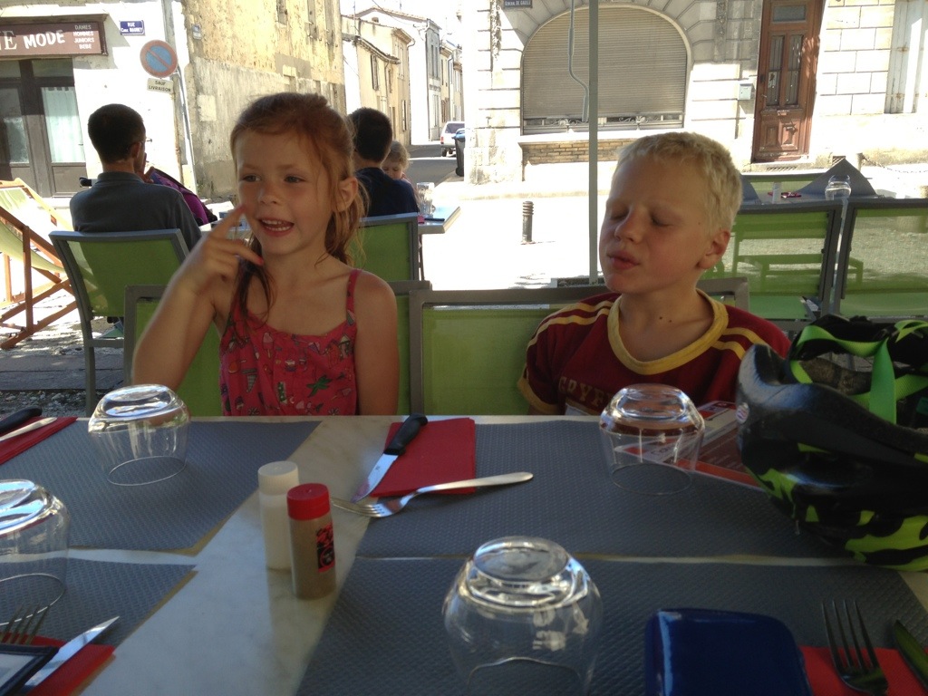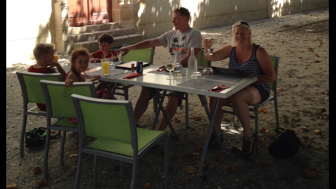 We got ready to go for a bike ride into saint Laurent, through the vin yards and onto the tiny but immaculate town. We needed to go into town so that stew could buy some swimming trunks ( budgie smugglers are required over here) so he didn’t need to wear my swimming costume again! (His wedding tackle fell out yesterday when he jumped in)… We also needed to get penny seen by someone as she had what appeared to be an abscess on her gum. The pharmacist couldn’t help us which meant we needed to find the doctor. Whist we assessed our options over doctors we stopped into the square for a pizza and a glass of wine…it was proper French lunch time with the children pottering around the church, and us enjoying the sunshine and some great food.
