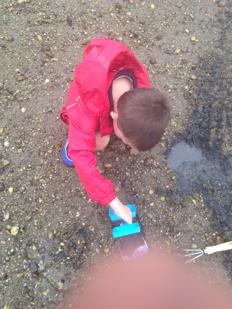 Last nights tea for stew and I was a plate of oysters and a baguette, and we used all the butter…. So I took Fraser in his jammies to get the goodies for breakfast….. And we didn’t disappoint. Noirmoutier butter with salt crystals and baguettes from the bakery…. Went with a great handpresso coffee , oj and chocolate twists left over from yesterday. I’m sure I’ve not mentioned the jam we have bought yet ( perhaps that’s for tomorrow!) but needless to say its plentiful. We sat with the scamps wrapped in sleeping bags whilst the wind howled around us! After breakfast we took shelter in the van for 20 mins for a downpour. We knew we needed to move pitches early, but had to wait for it gone empty. So we donned our waterproofs, got out cockle rakes and headed for the black sands. I was wearing fetching pair of jelly shoes…. It’s ok sarah b, no one knows me here! It was like Fraser had never seen the beach before, he was loving it! We caught crabs, oysters, clams, moules and sea snails. Penny meanwhile was having a brief spell as a purple minion!!