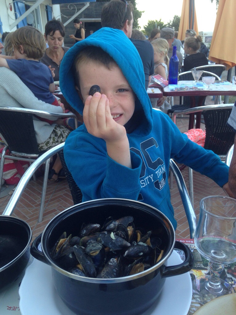 Dinner time…….we went to the local resturant.. I use the term loosely, as it was a falling down house, whitewashed with a few plastic tables outside with a grumpy teenager serving….. For us it was moules all round, well 3 out of 4! Penny had a pizza whilst the rest of us had mussels, Fraser had an adult portion…. And polished off nearly the lot! The perfect dinner… The sound of the sea, the taste of the sea with a view to match!