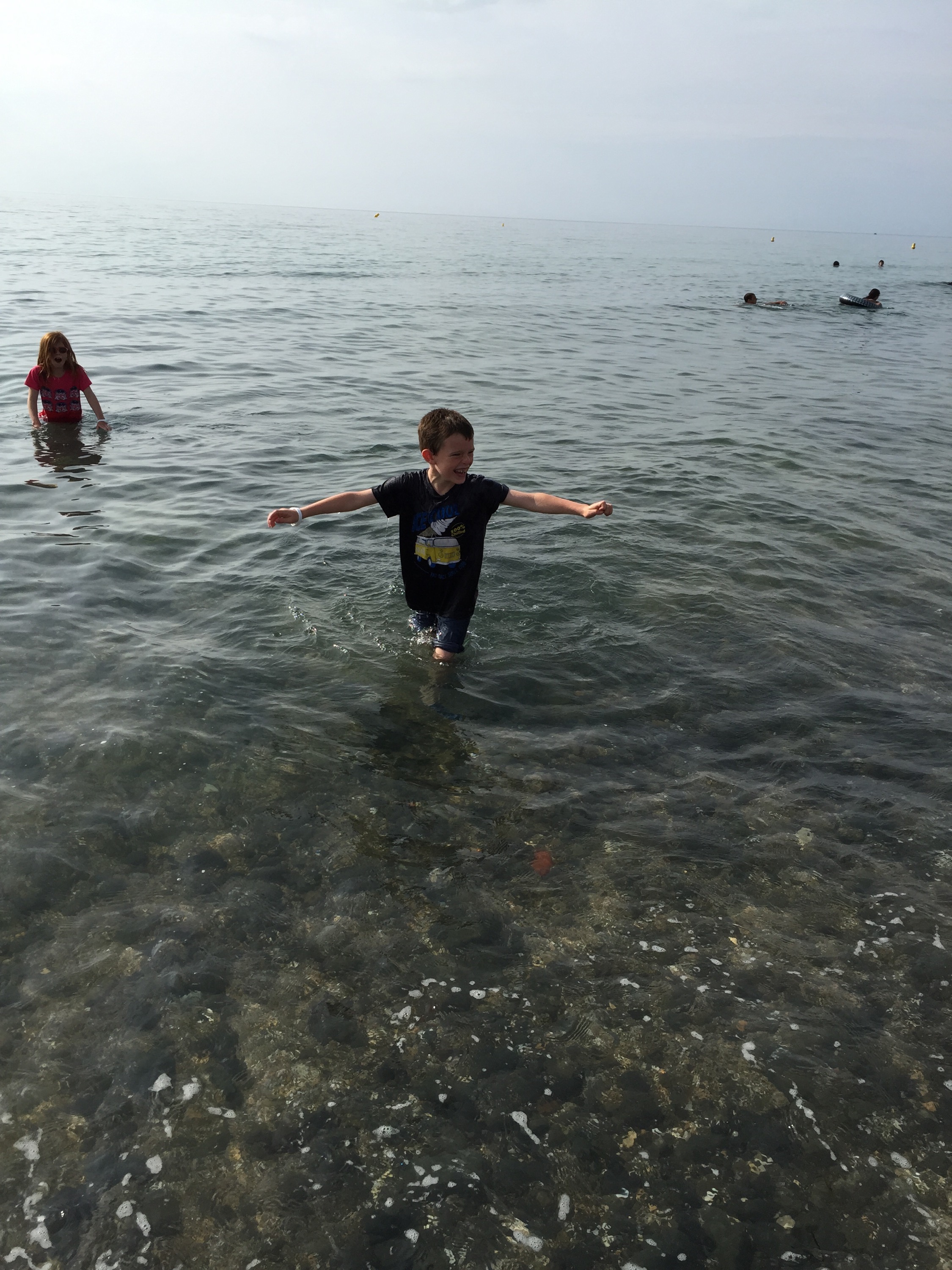 Once set up we put that right and had a few minutes of a gymnastics display and football whilst we had a cheeky beer. We decided that as time was marching on we would pop to the beach for a look at the sea…. what started with a paddle ended up with eh children swimming in their clothes! stew wondered back to get his fitbit steps up for the day and got a change of clothes and the children had a ball in the sea… so lovely and warm too!