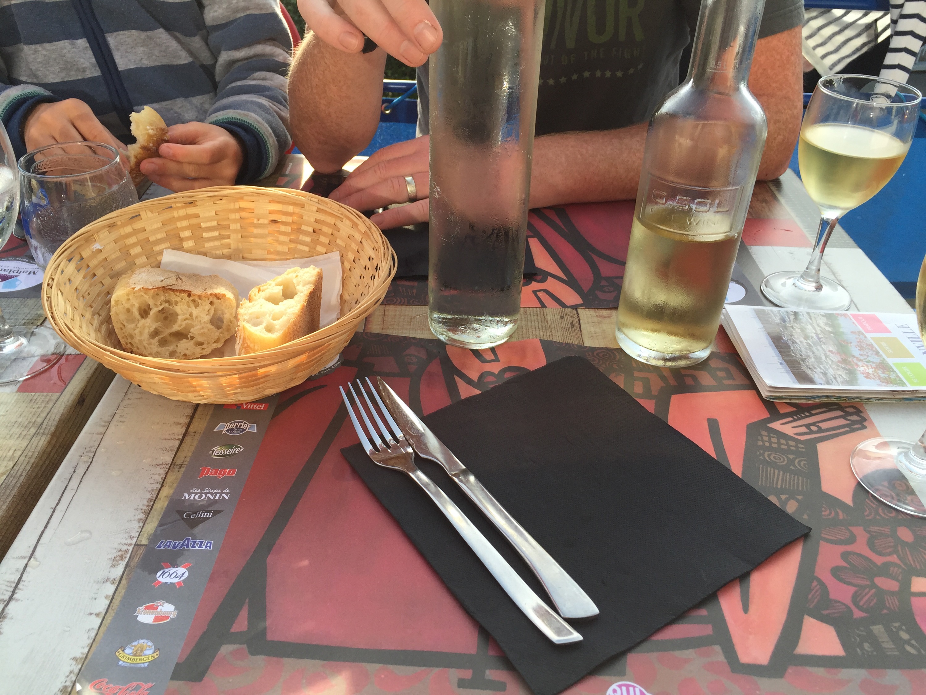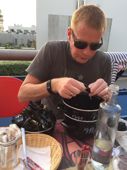 Following the beach we headed to the little restaurant on the campsite right by the beach (we are at camping l’ermitage in grandville) where Stew fraser and I had huge portions of muscles, super cold white wine (not fraser) and fresh (still warm) bread, whilst penny opted for a grilled ham and chips option. Coffee and deserts followed and we walked away wondering how so many restaurants in england get it so wrong!