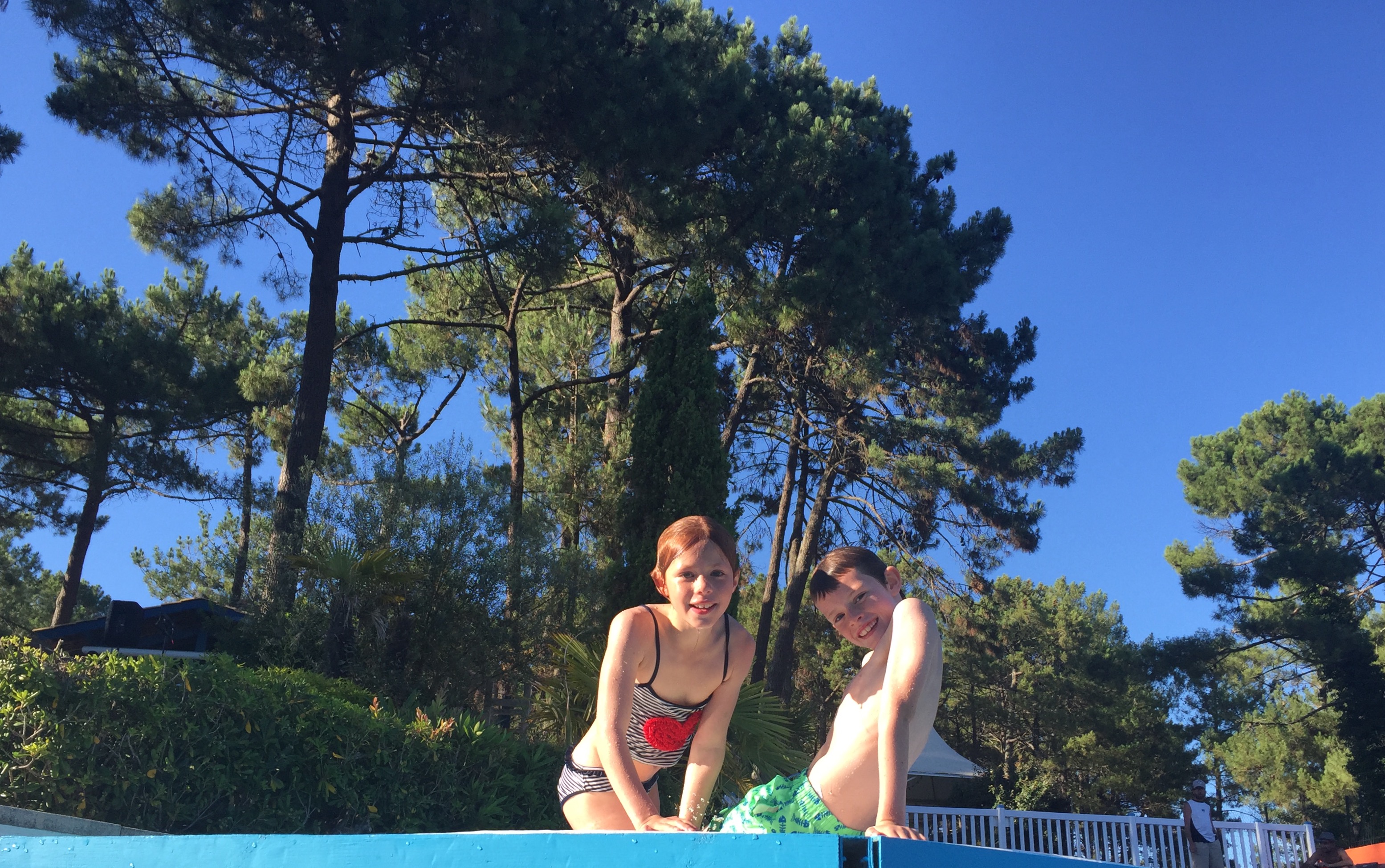 We did a supermarket sweep of the shops as they were shutting soon and got essentials in a haphazard way before pushing on up the road. We drove through the beautifully manicured vineyards of the Medoc region and we knew we were arriving in our destination. Less than 30 mins from arrival to complete set up we hit the pool. We visited this site a few years ago and the children loved the pool they spent 3 hours this afternoon up and down the sldes and generally playing and having a great time. The heat finally finished them off tonight and thankfully they headed to bed early to catch up on some of the sleep they were missing, not before eating huge ice creams!