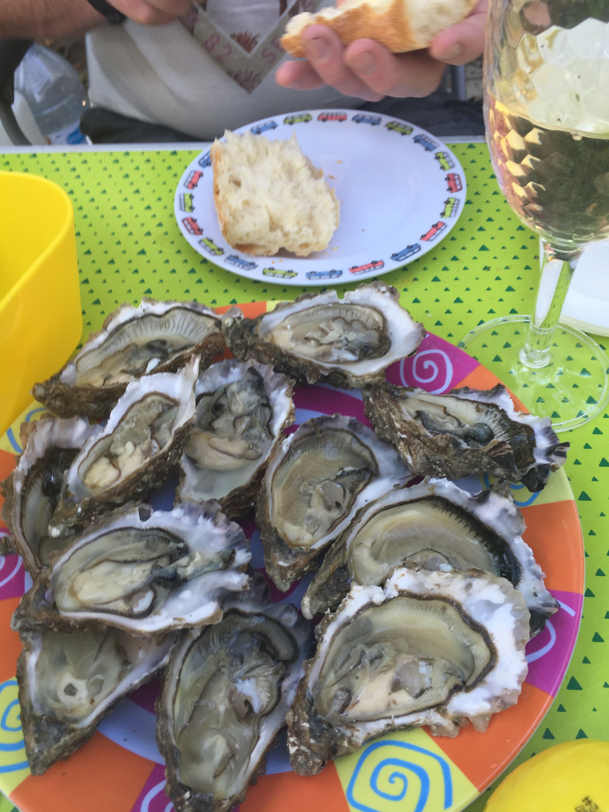 Early evening was Oysters and nibbles time – we had stopped on the way to Soulac. We had a dozen Oysters, some olives, anchovies, peanuts and of course french bread! All of course with little vin!