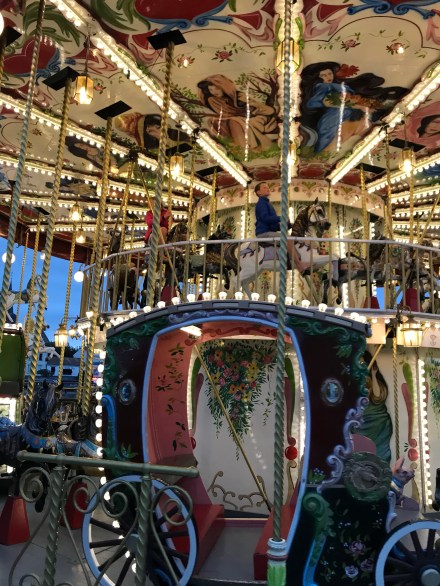 We moved around the town to the carousel which the children wanted to go on…. they have been going on it for the last 8 years, and we feared they might be too big, but the sparkly lights and traditional horses drew them in!