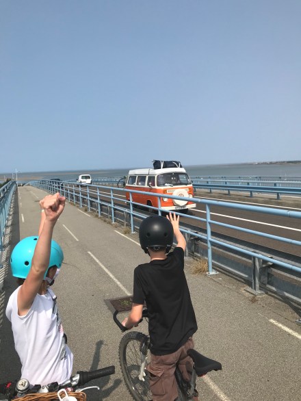 I was tracking their progress from the van and trying to meet up with them at parts… and accidentally went over to the island once when I was thinking there would be somewhere good to stop before I got as far as that. I looked at the map and turned around and went back over the bridge. I saw a tiny layby and pulled in to assess my options…. as I glanced to the track in the woods on the left I saw 3 familiar little heads pop over the hill! Fabulous timing as their legs were starting to wear out. Some treats topped back up pennys basket and both the children were brimming with pride that they had already cycled 28 miles and had decided they would ride the whole way to the campsite! I was astounded! As well as being astounded I was also facing the wrong direction on a fairly major route.