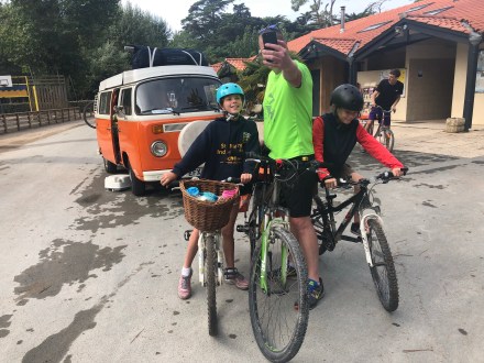 The first leg of the cycle ride took the adventurers back to st jean de mont, so a familiar route, but this time the wind was in their face. Once again they stopped on the sea front for a picnic and an ice cream. Then back on the bikes past all the french campsites which were all empty… the season seems to have closed. The next bit of the cycle path was through the forrest for about 20km. Fraser described it as a roller coaster as there were lots of little humps. The forrest was deserted… on the whole journey they only saw about 10 people. This part of the journey was fun and kept the children going really well.