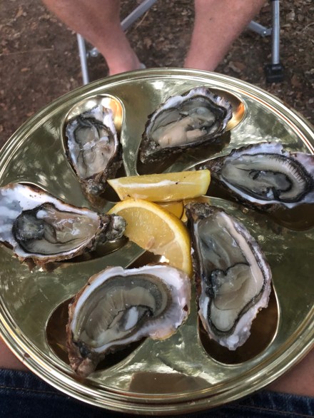 Showers all around and there were no protests when they snuggled into their beds! Stew and I sat outside with a dozen oysters, a bowl of Prawns and a bottle of wine… before the cheese and port came out. Standard Noirmoutier.