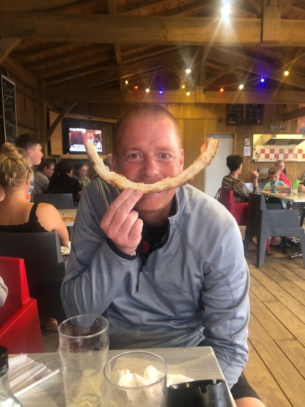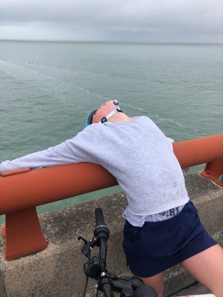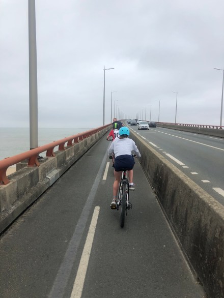 The traffic to get onto the island was choc a block so we picked a car each to beat! Our cycle into the wind was hard, Fraser was feeling the burn and penny was powering up the hill. We flew over the top of some impressive wind surfing, and down the hill… passing the man who had seen me earlier squatting in the bushes… much to the children’s delight!